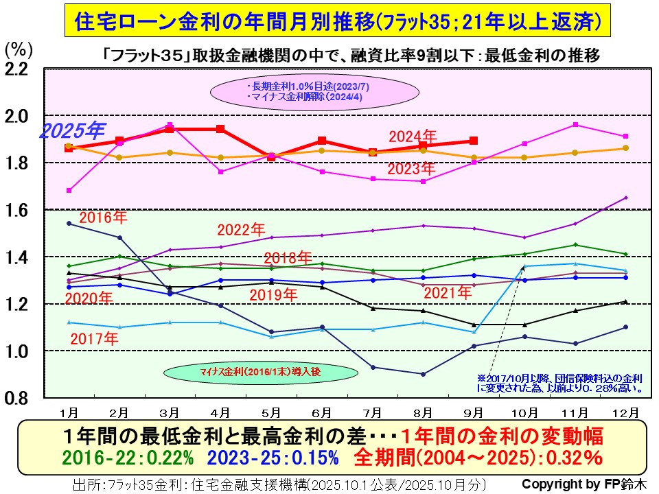 第2次安倍政権が発足した以降、フラット35の金利の1年間の最高金利と最低金利の利幅は、2016年~22年は僅かに0.22%、2023年~25年は0.15%と低くなっています。