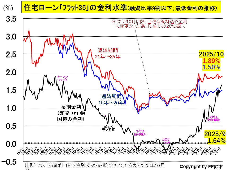 ◆代表的な長期固定の住宅ローン商品「フラット35」の2025年10月融資金利は、前月と変わらず1.89%(返済期間21年以上のタイプ)となりました。
