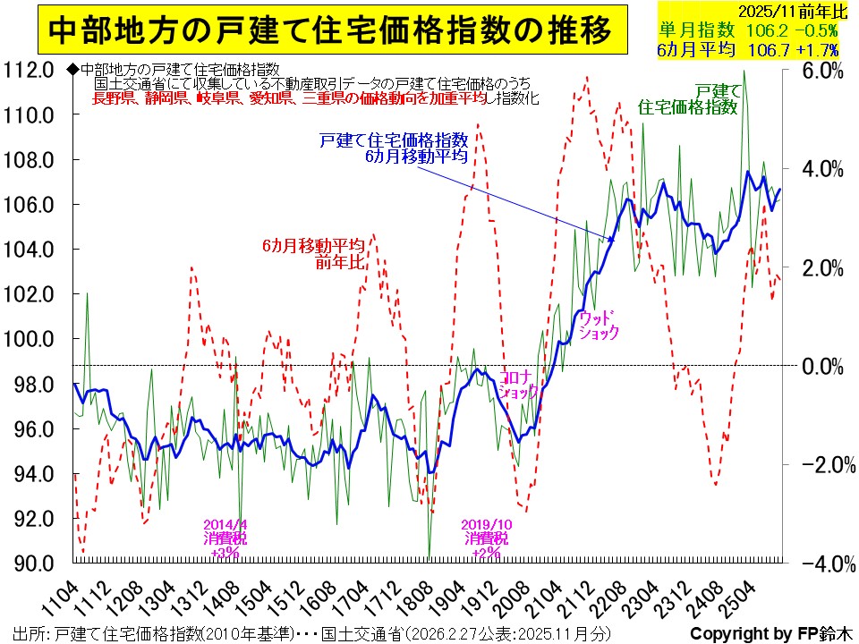 ★2026年2月27日に国土交通省が発表した2025年11月の中部地方の戸建て「住宅価格指数」(6か月移動平均)は12カ月連続で前年比上昇。